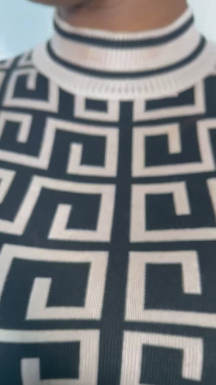 Upgrade your wardrobe with our Fret Print High Neck Knit Dress. This stunning body-hugging dress features a modern geometric print and long sleeves for a sleek, stylish look. Made with high-quality knit fabric, this dress is not only fashion-forward but also comfortable to wear. Elevate your fashion game today.